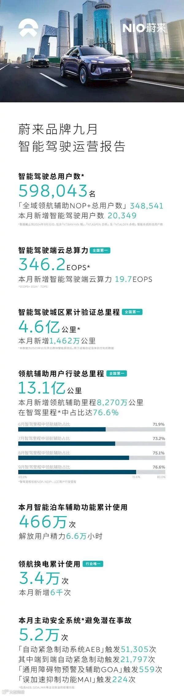 在智能驾驶里程方面,9月份用户智驾里程再次突破1亿公里的里程碑,其中领航辅助里程占比持续攀升至76.6%。