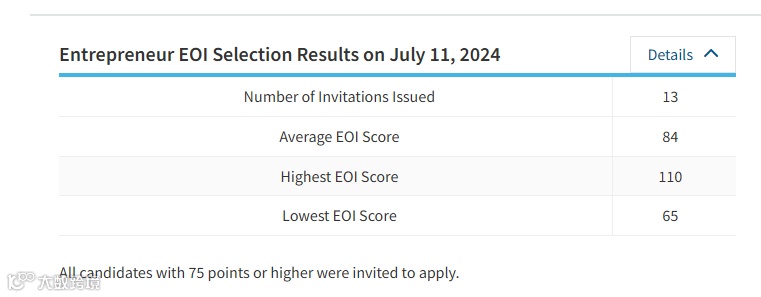本轮抽签的EOI(Expression of Interest)最高分为110分,平均分为84分,最低分为65分。