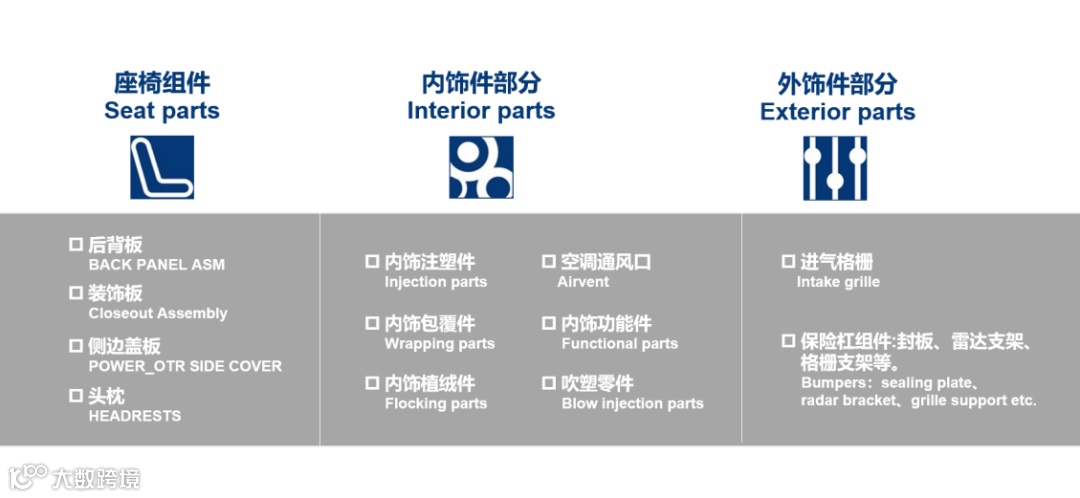 主要产品包括:汽车座椅组件、汽车内饰件、塑料注塑件,麻纤维注塑件,包覆件,植绒件,总成件等。我们拥有从原麻到汽车内饰和座椅零部件总成的一体供应链,同时具有完善的集研发、生产和销售为一体的新能源及传统汽车内外饰零部件、新能源汽车座椅舒适性系统配套零部件、轻量化、高耐磨材料的能力。公司拥有独立开发的全自动冲压成型、注塑成型、喷胶、包覆、植绒、装配生产流水线及各类进口全自动设备和机器,实验室有各类齐全的检测和实验设备,同时我们还专注于模具技术的研发,公司的模具车间拥有CNC数控机床、精雕机、火花机模具制造设备。