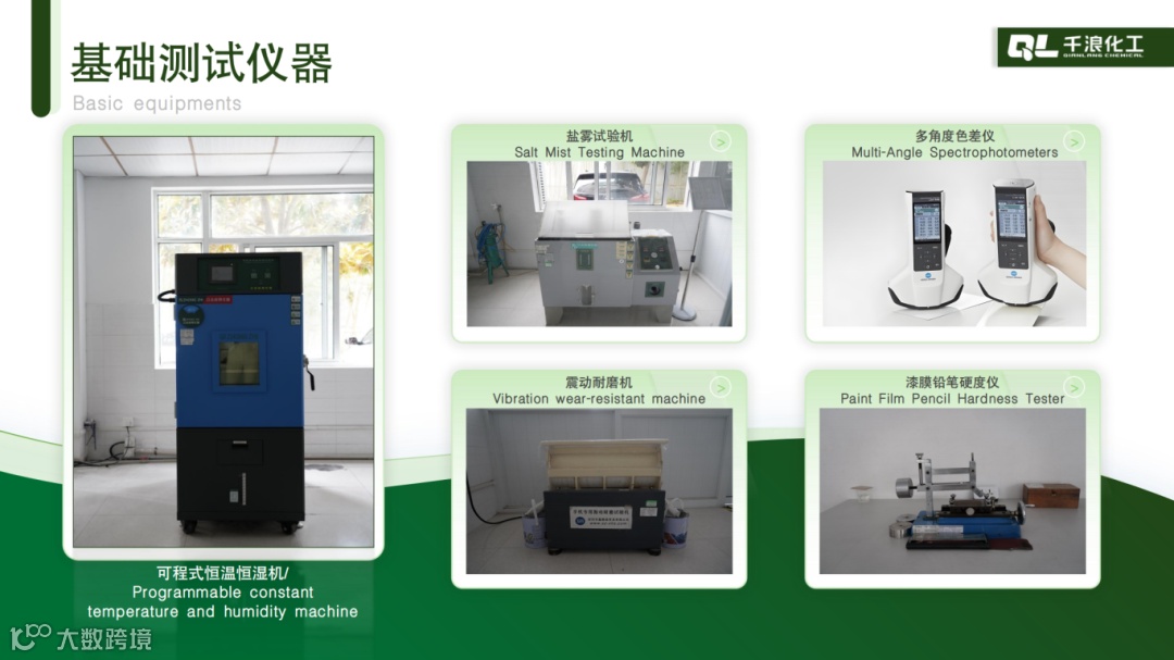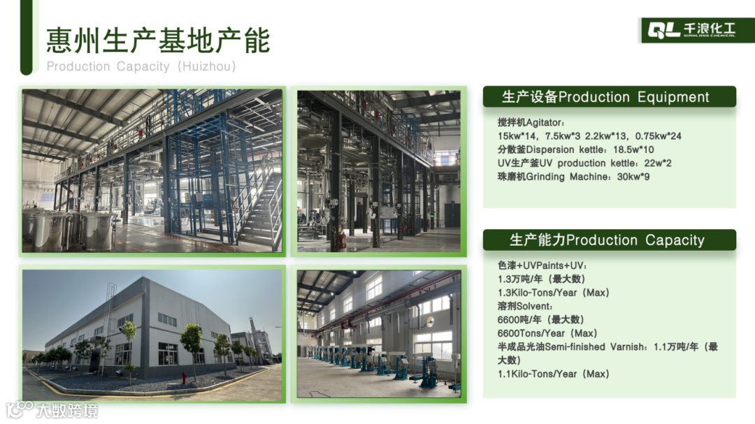 千浪化工旗下在上海,惠州拥有两个生产基地。总占地面积超过50000平方米,同时在深圳,天津,重庆,东莞设立四个调色中心。主要生产研发PU/UV塑胶涂料,水性塑胶涂料,PVD真空电镀漆,手感涂料等。