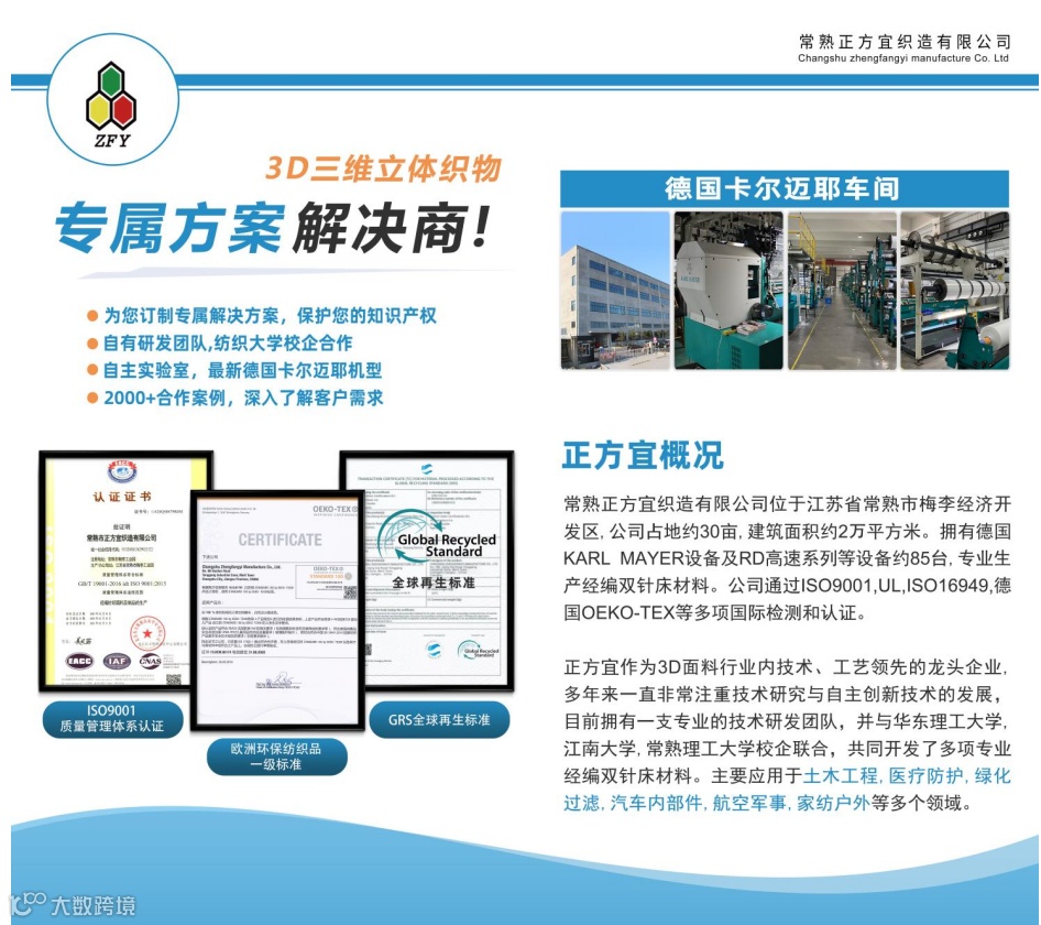 正方宜作为3D面料行业内技术、工艺领先的龙头企业,多年来一直非常注重技术研究与自主创新技术的发展,目前拥有一支专业的技术研发团队,并与华东理工大学,江南大学,常熟理工大学校企联合,共同开发了多项专业经编双针床材料。主要应用于土木工程,医疗防护,绿化过滤汽车内部件,航空军事,家纺户外等多个领域。