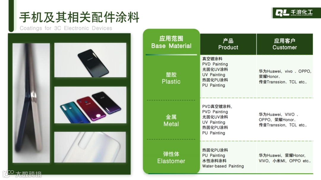 公司拥有“QL”自主品牌,自2002年成立以来,便致力于通过交互式研发,柔性制造,即时响应模式,为高端3C电子行业,乘用汽车零部件行业,提供专业的表面涂装解决方案。