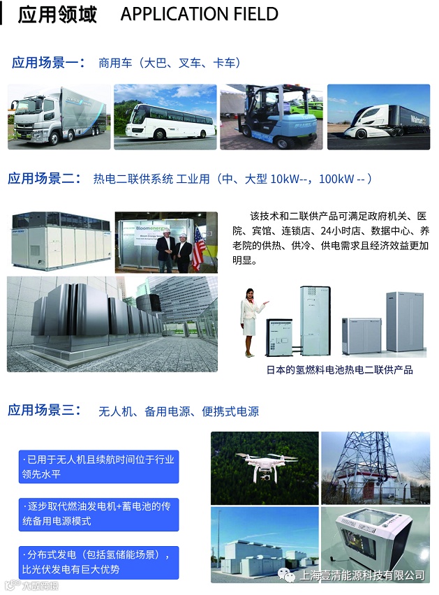 壹清科技采用超薄合金板高精密冲压成型,表面采用高电导率,高耐腐蚀涂层,这样独家领先的技术制造出的燃料电池应用广泛于多个领域:商用车(大巴、叉车、卡车)、热电二联供系统工业用、无人机、备用电源、便携式电源等。