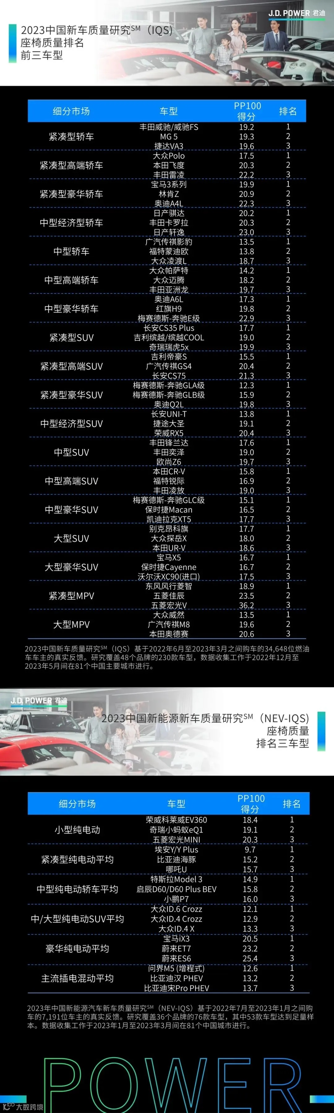 根据J.D. Power 2023中国新车质量研究SM(IQS),通过数据分析,筛选出各车型细分市场中座椅质量表现优异的前三名车型,这些车型凭借卓越的座椅设计和制造水平,成功赢得了消费者的认可与信赖,成为市场中的佼佼者。