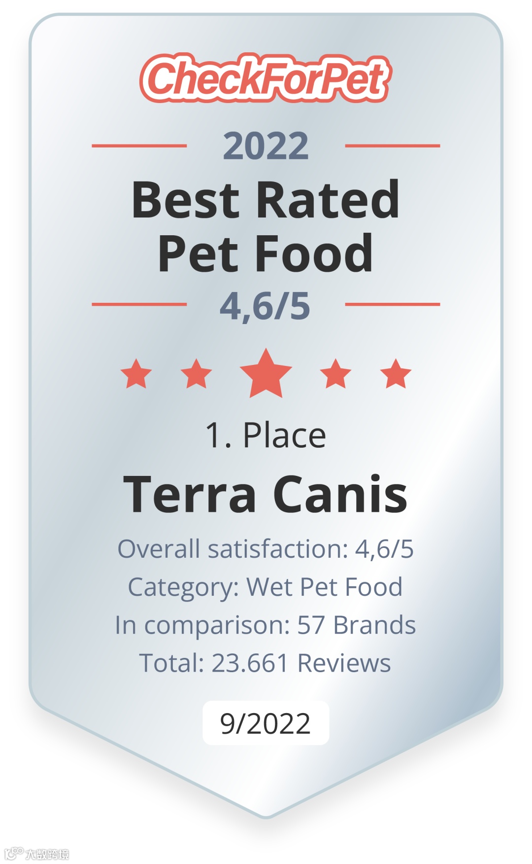 近期,天奇旗下代理的品牌Terra Canis泰拉狗系列以 905 项独立评级和 4.6 的综合评分在250多个不同的品牌中脱颖而出,获得德国2022年最佳狗湿粮奖,成为年度最受好评的宠物食品品牌!