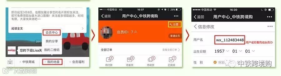 1.关注中铁跨境购二维码后,点击 我的地盘,进入会员中心
