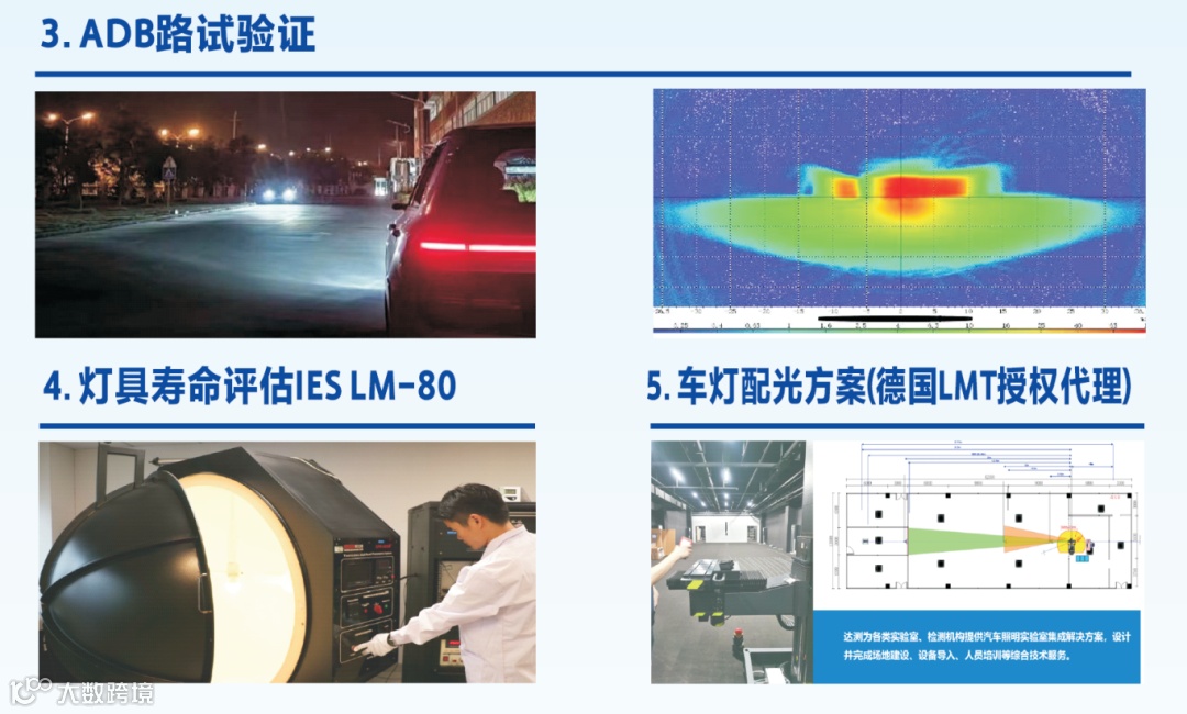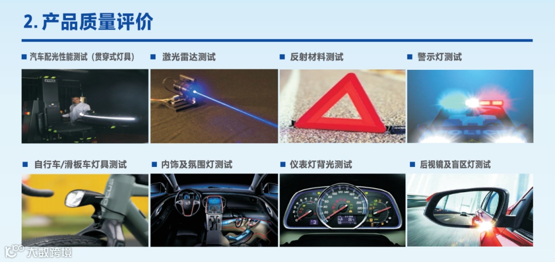 公司自成立以来,凭借雄厚的标准及质量技术积累、国内外各类先进光学仪器设备,为众多传统汽车及新能源汽车品牌的灯具研发提供多项先进功能的测试验证,为传统商业照明、教育照明、景观评价、道路评价等方面完成多项专业服务,在行业中形成专业可信的机构形象。