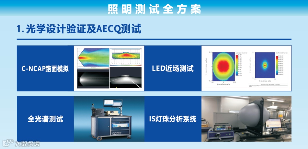 公司具备各类先进光学相关仪器设备,包括德国LMT测角光度计、美国激光测试系统、德国IS成像颜色/亮度计及LED灯珠测试系统、紫外线老化机、德国METROGON 30汽车纵贯式车灯测试系统、日本眩光测试相机、ESPEC多种环境试验箱等。测试的项目包括电气安全、材料燃烧、产品热危险、灯具配光、显色性、照度、发光强度、亮度、色度、透过率、雾度、LED特性、产品寿命评估、可靠性测试等。是国内能够供照明全行业(光源、产品、应用现场)技术服务能力最全面的光学试验室。
