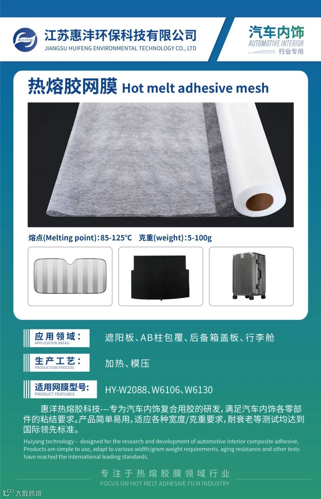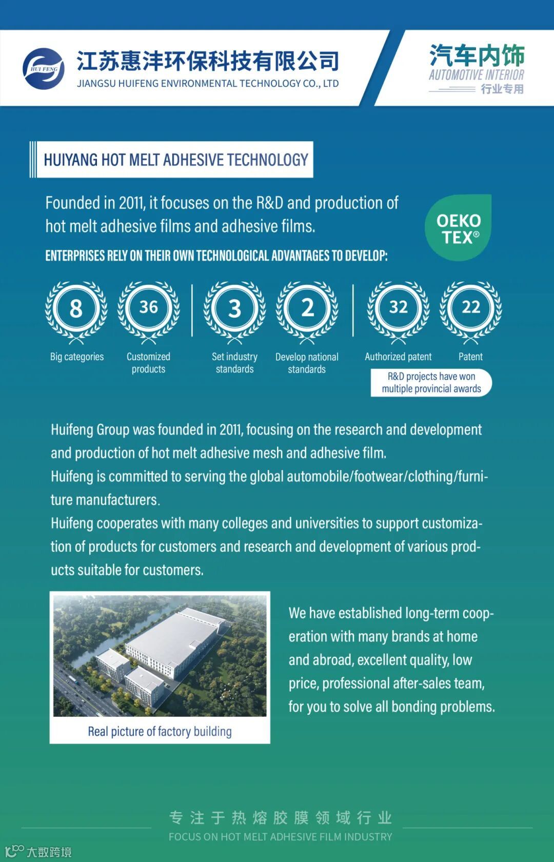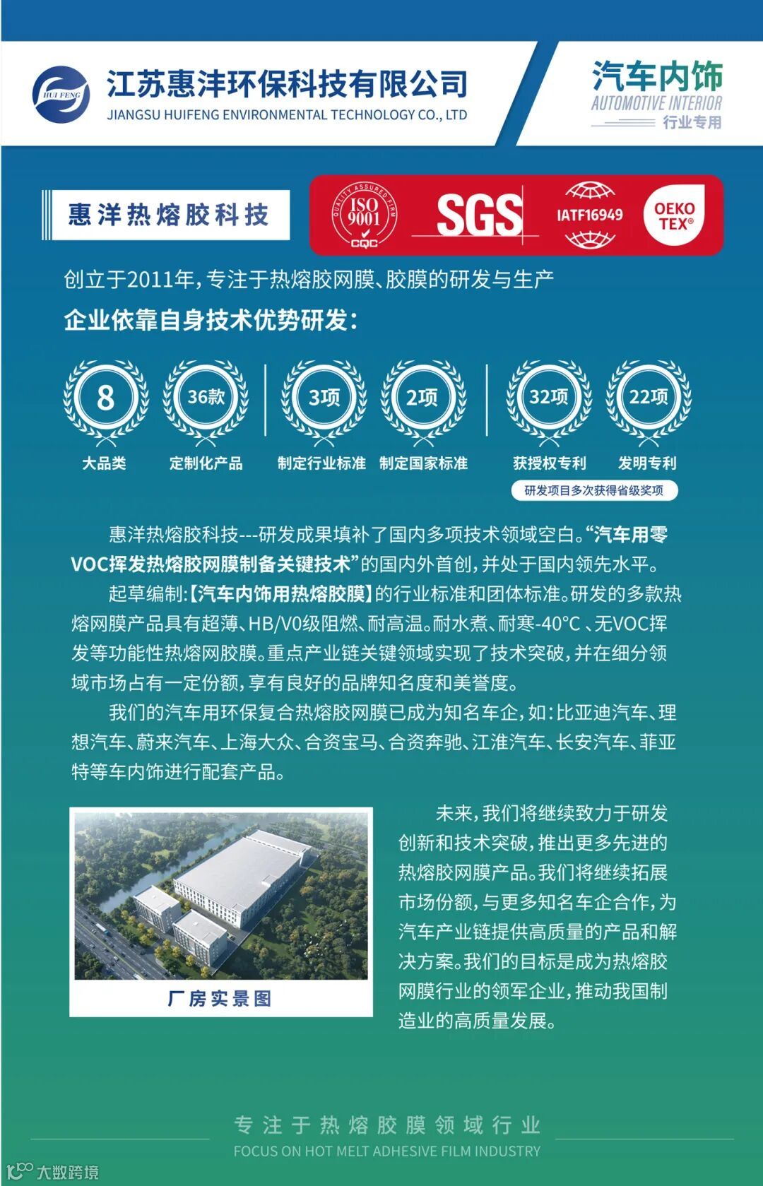 江苏惠沣环保科技有限公司(以下简称:惠沣科技)创立于2017年,公司长期从事热熔胶网膜在汽车产业链等不同行业领域和使用环境的热熔胶网膜的研发与生产。企业依靠自身技术优势研发6大类,30款定制化产品。制定行业标准2项,参与国标1项。获授权专利28项,发明专利10项。研发项目多次获得省级奖项。研发的热熔胶网膜产品填补国内高分子PP板材的粘贴、氢燃料电池膜电极粘贴封装领域的空白。技术创新、自主研发,其“汽车用环保复合热熔胶网膜制备关键技术”被中科高技术企业发展评价中心认定为国内外首创,处于国内领先水平。成功解决了汽车内饰件,因胶水问题导致的VOC超标难题。填补了国内空白,打破了法国BOSTIK的热熔胶网膜在国内的行业垄断。解决2项国际性粘接难题:聚丙烯板材的粘贴、氢能源电 池隔膜阻碍质子穿透低的问题。成功研发多款国内首创产品:超薄3克/平米、HBVO级阻燃、耐开水煮等功能的热熔网胶膜,多项产品在重点产业链关键领域实现“锻长板”“补短板”“填空白”或在细分领域实现关键技术首创等情况,处于国内领先甚至国际较高水平,且产品均在其细分领域市场占有一定的份额,具有较好的品牌知名度和美誉度,凸显了我司制造业高质量发展的创新活力。