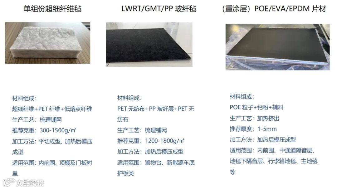 制品类:NVH产品、隔音隔热垫、轮罩、底护板、地毯等产品。