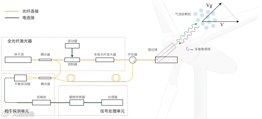 光纤激光器产生的信号光通过光学天线发射到待测空气中,与其中的气溶胶颗粒作用产生包含其速度信息的后向散射信号。由多普勒原理可知,回波信号的多普勒频移 fd与气溶胶颗粒运动速度(即风速)成正比,因此光学天线接受到的后向散射信号通过和系统内光纤激光器产生的本振光拍频和数字解调,即可处理得到待测目标的风场信息。