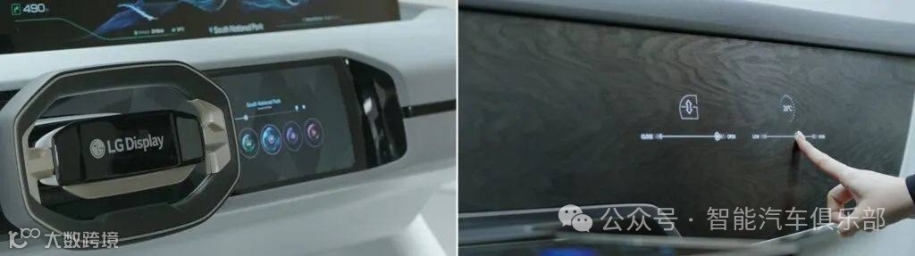 LG Display的Shy Tech技术应运而生,它能够在中控台、门把手周围等隐藏空间处粘贴汽车装饰膜(Decorative Film),这项新技术是以胶片的形式粘贴在屏幕上,在屏幕不使用时完美融入汽车内饰,呈现出木纹或金属质感,而在激活状态下则变为显示屏,提供信息或执行功能,极大地提升了汽车内部的设计感。