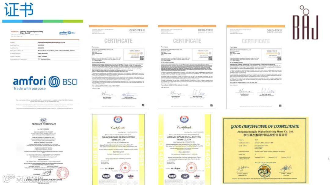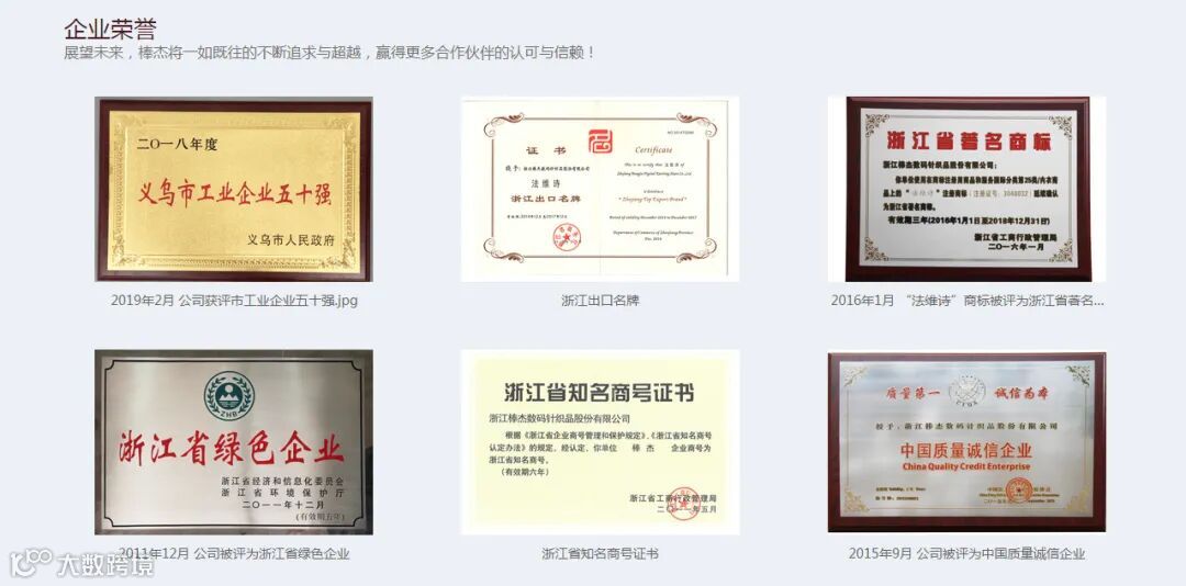 多年来,公司始终注重质量控制、品牌建设、技术创新。公司已先后通过ISO9001:2015质量管理体系认证、ISO14001:2015环境管理体系认证、Oeko-Tex Standard100认证、WRAP认证、BSCI认证等一系列社会责任和产品质量体系生产资质认证,并通过了企业清洁生产验收。公司先后荣获“浙江省名牌产品”、“浙江省著名商标”、“金华市知名商号”、“浙江省守合同重信用AAA级企业”等多项荣誉。