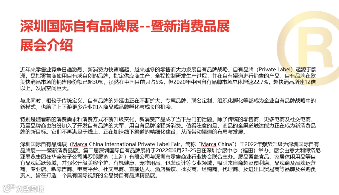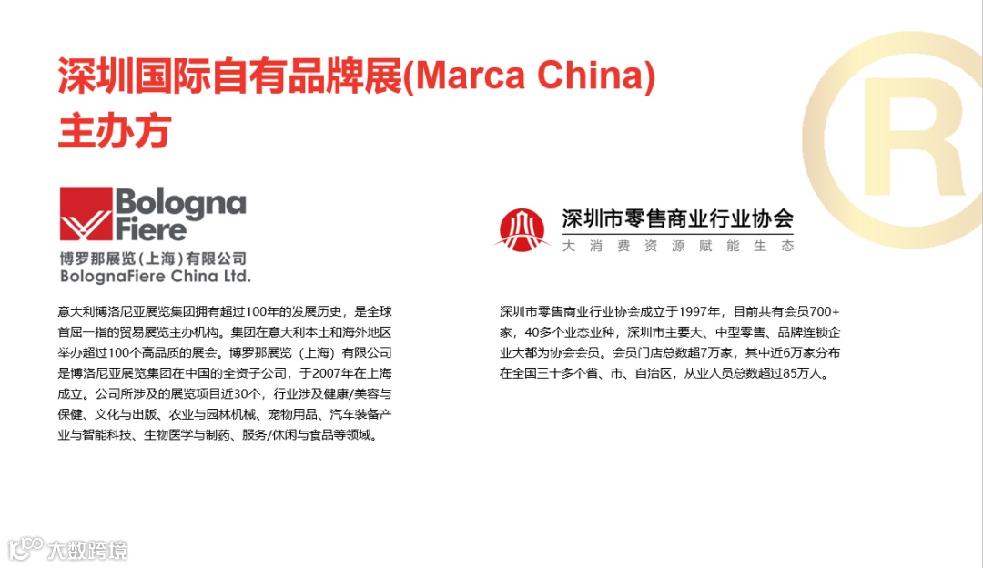 意大利博洛尼亚国际自有品牌展及峰会(Marca by BolognaFiere,简称博洛尼亚自有品牌展)是欧洲自有品牌领域内首屈一指的业界盛会,已成功举办了16届。该展会于2021年入驻中国,名为深圳国际自有品牌展,成功在深圳会展中心宝安新馆举办了第一届。2022年,第二届深圳国际自有品牌暨新消费品展将于6月23日-25日在深圳会展中心(福田馆)举行。