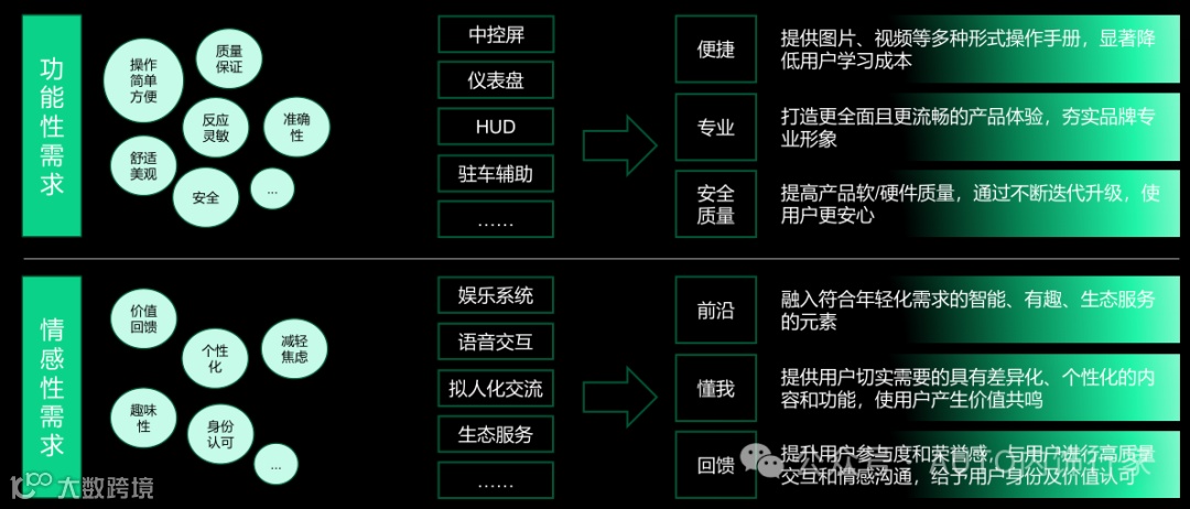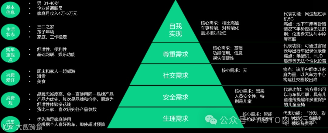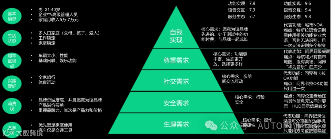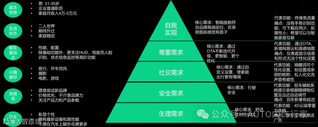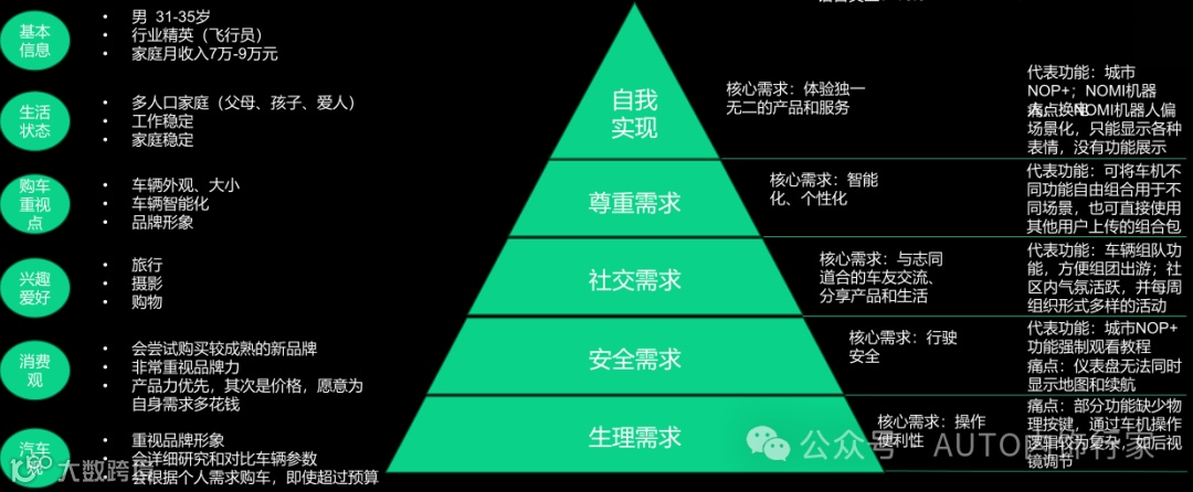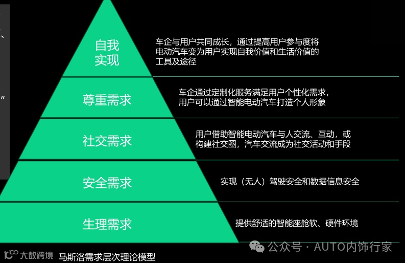 随着电动汽车智能技术发展和品牌升级,智能座舱不应再仅满足用户生理需求和安全需求。伴随智能汽车定位从“出行工具”向“第三生活空间”转变,产品应聚焦用户更加高级的社交、尊重和自我实现需求,打造个性化品牌满足不同人群的多样化精神需求;