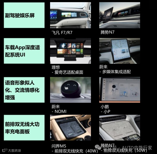 近两年,新能源汽车销量及渗透率迅速增长,在头部新能源企业引领下,智能座舱产品快速发展、迭代,加上汽车媒体宣传广度和深度增加,消费者需求日益明确、聚焦,使座舱基础功能及设计逐渐向主流靠拢,例如: