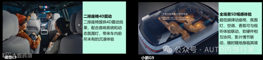 随着汽车智能化的发展,以新势力品牌为代表,影音娱乐功能逐渐向4D/5D沉浸式体验发展,影音与座椅、空调、香氛、氛围灯等功能联动,打造全方位立体影音体验。对于喜欢体验新鲜事物的年轻人和小朋友具有十足的吸引力。