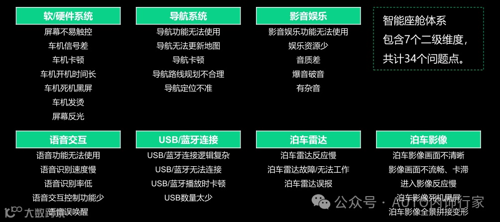 根据体系将智能座舱质量调研结果进行分类,并通过用户描述,挖掘用户需求,为车企解决智能座舱质量问题提供方向。