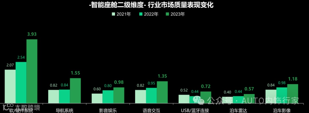 2023年,智能座舱各维度的市场质量表现均有不同程度的下滑。