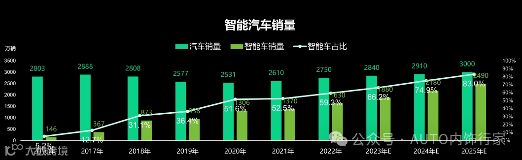 近两年,汽车市场整体呈现复苏趋势,而智能汽车销量及占比持续增长,根据相关数据预测,到2025年智能汽车基本普及(占比达83%)智能汽车两大特点为智能座舱及智能驾驶,受限于技术、成本、道路条件等因素,智能驾驶方面发展缓慢,智能座舱成为各大厂商最容易发力,用户也最容易感知的领域,未来很长一段时间将是汽车,尤其新能源汽车重要发展方向。