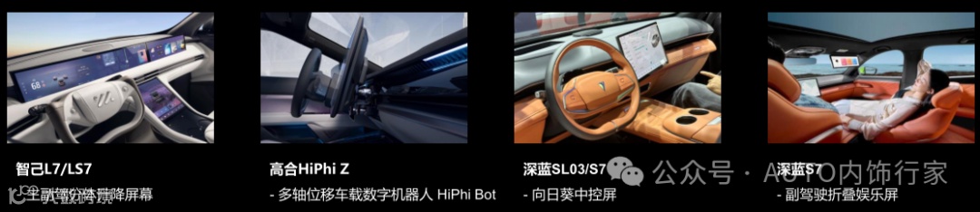 例如智己系列推出的主副驾屏幕分体升降,满足主副驾不同需求;高合HiPhiZ使用高速运动的机械臂使屏幕实现4自由度(8向)无极调节,配合语音助手打造数字机器人,增加人机舒适性及仪式感,深蓝系列推出“向日葵”屏与此类似;深蓝S7副驾驶屏幕创新性的布置在了遮阳板位置,便于配合副驾座椅调节找到最佳观影位置。