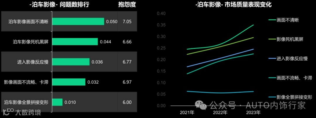 2023年,泊车雷达维度下各问题的问题数、抱怨度、市场质量表现均差异不大。