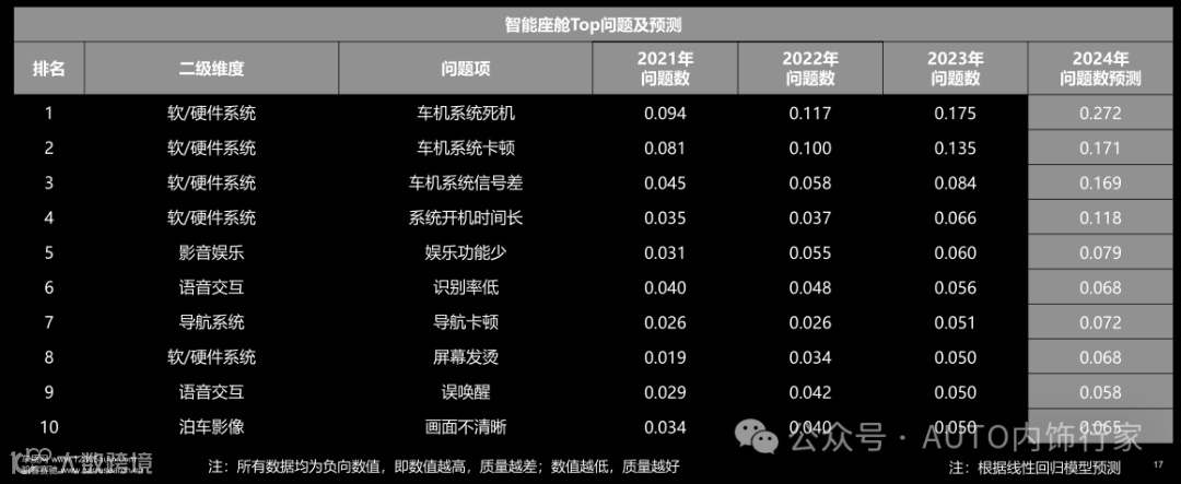 根据模型预测,2024年车机系统死机和卡顿的问题数将分别达到0.272和0.171。