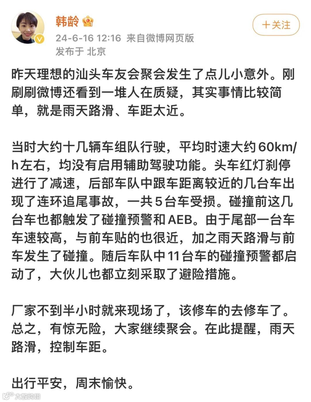 针对上述事故,今日午间,理想汽车智能驾驶产品负责人韩龄在微博发文称,昨天理想的汕头车友会聚会发生小意外,看到不少人质疑,其实事情比较简单,就是雨天路滑、车距太近。