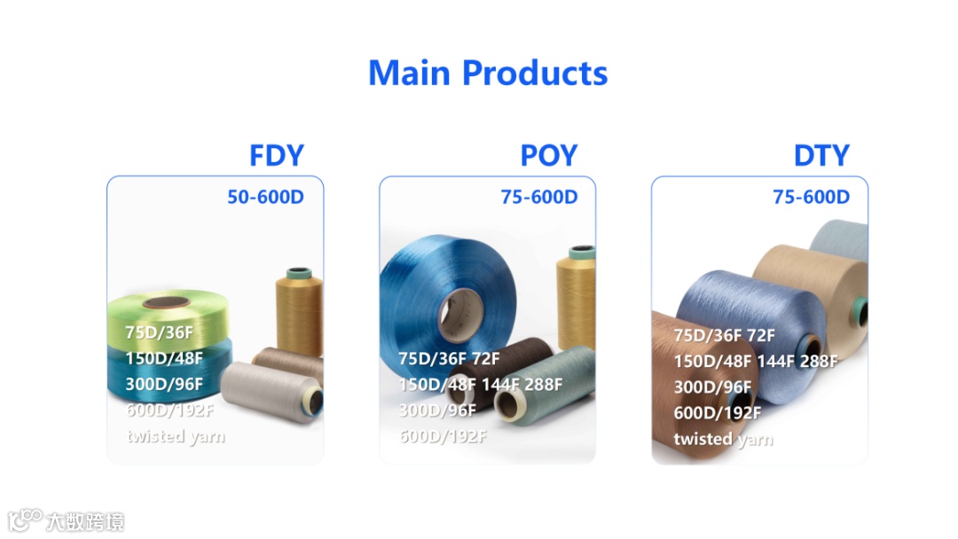 汇隆新材以原液着色工艺为核心技术,是国内较早实现规模化生产差别化有色涤纶长丝的企业之一,现拥有2座生产基地,自有母粒产线,搭载亿元级自动化纺丝生产设备,具备有色涤纶长丝20万吨的年产能力。产品(POY/DTY/FDY/HOY)涵盖免染显色、功能性、再生循环等多个系列,囊括10000+色彩选择,堪称“涤纶色丝界的沃尔玛”。