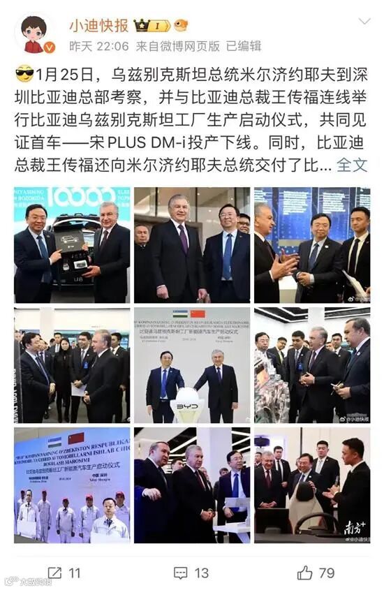 1月25日,乌兹别克斯坦总统米尔济约耶夫到深圳比亚迪总部考察,并与比亚迪总裁王传福连线举行比亚迪乌兹别克斯坦工厂生产启动仪式,共同见证了首车——宋PLUS DM-i投产下线。同时,比亚迪总裁王传福向米尔济约耶夫总统交付了比亚迪在乌兹别克斯坦市场的第1万辆新能源汽车——一辆仰望U8。