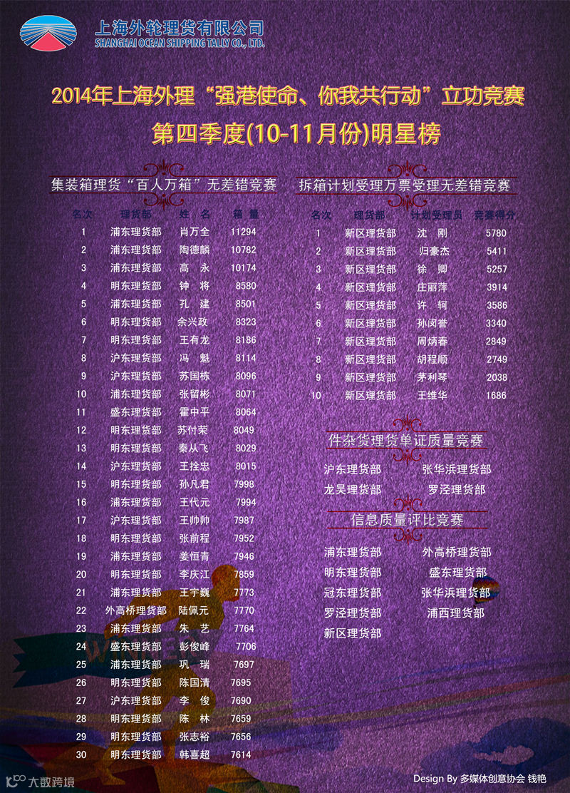 自今年4月起,公司开展了“强港使命、你我共行动”立功竞赛活动,团结动员公司广大员工积极投身理货生产“主战场”。现将第三季度(10-11月份)竞赛活动的明星榜进行公布。