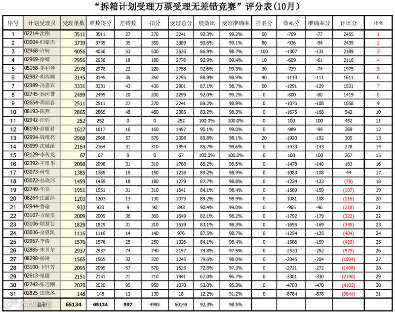上海外理2014年立功竞赛10月份统计发布(计划受理)
