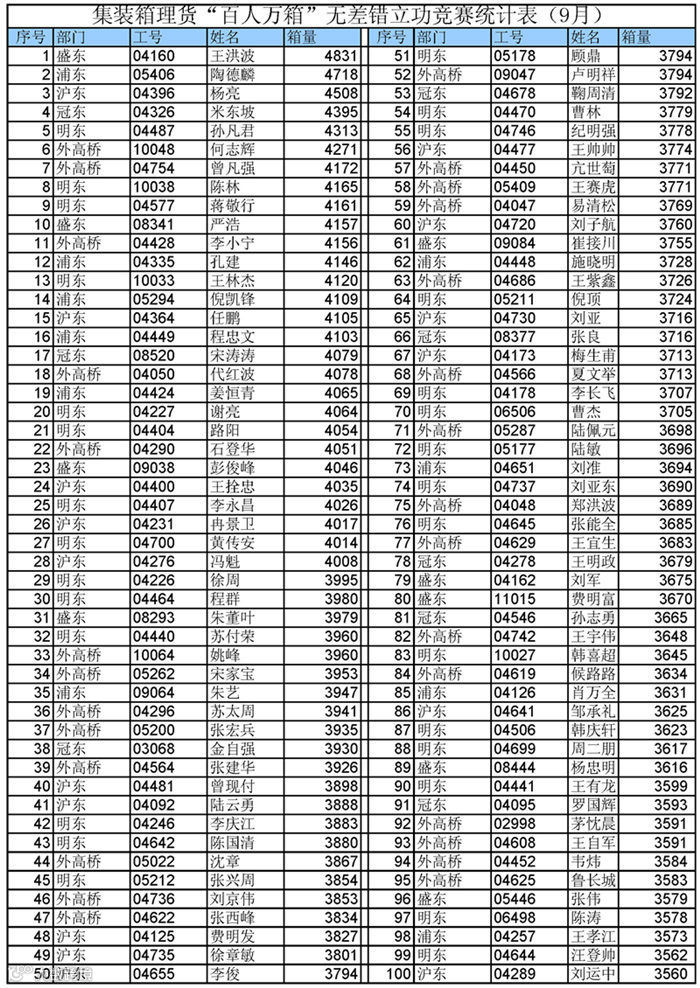 上海外理2014年立功竞赛9月份统计发布(集装箱理货) 上海外理SHOST