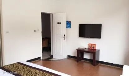 进门看到的是,从经典的红木 柜子,到房间内的木地板,再到墙上还挂着一台液晶电视,配上朱红色的小桌子,显得格外的和谐。