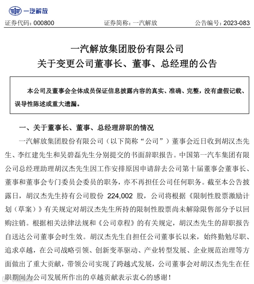 自邱现东升任一汽集团董事长后,中国一汽的人事变动仍在继续,这次是一汽解放。10月31日,一汽解放发布公告称,胡汉杰辞去公司第十届董事会董事长、董事和董事会专门委员会委员的职务,亦不再担任公司任何职务。胡汉杰离任后,由现任一汽解放集团股份有限公司董事、总经理、党委副书记,兼一汽解放汽车有限公司总经理、党委副书记,兼本部中重型车产品线总经理吴碧磊接替,出任一汽解放董事长职务。此外,现任一汽解放集团股份有限公司副总经理兼一汽解放汽车有限公司副总经理兼青岛整车事业部(青汽公司)总经理、党委书记兼青岛整车事业部青岛中重型车产品线总经理、轻型车产品线总经理李胜接替吴碧磊原职位,出任一汽解放总经理。