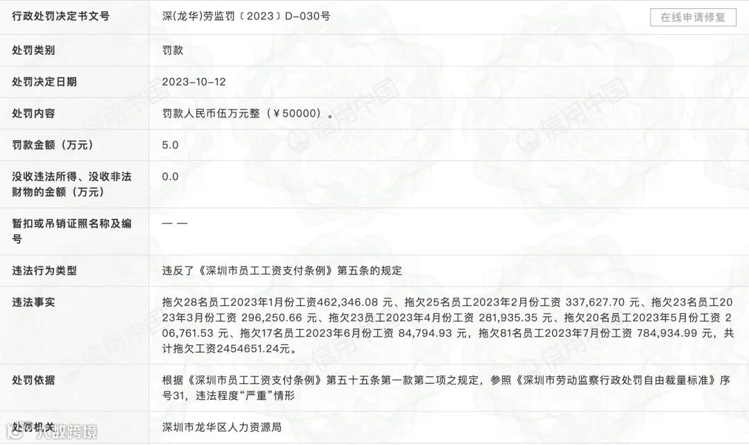 据信用中国官网显示,宝能汽车销售有限公司、深圳市宝能汽车有限公司、宝能新能源汽车集团有限公司深圳分公司因拖欠员工工资,分别被深圳市龙华区人力资源局罚款5万元。宝能汽车销售有限公司:拖欠28名员工2023年1月工资46.23万元、拖欠25名员工2023年2月工资33.67万元、拖欠23名员工2023年3月工资 29.63万元、拖欠23员工2023年4月工资28.19万元、拖欠20名员工2023年5月工资20.68万元、拖欠17名员工2023年6月工资8.48万元,拖欠81名员工2023年7月工资78.49万元,共计拖欠工资245.47万元。深圳市宝能汽车有限公司:拖欠163员工2023年1月工资219.61万元、拖欠26名2023年2月工资25.14万元、拖欠162名员工2023年3月工资212.14万元、拖欠36员工2023年4月工资17.15万元、拖欠160名2023年5月工资217.95万元、拖欠64名员工2023年6月工资36.92万元,共计拖欠工资728.91万元。宝能新能源汽车集团有限公司深圳分公司:拖欠320名员工2022年12月工资764.46万元、拖欠309名员工2023年1月工资705.53万元、拖欠287名员工2023年2月工资626.51万元、拖欠262名员工2023年3月工资568.20万元、拖欠221员工2023年4月工资397.58万元、拖欠210名2023年5月工资404.47万元、拖欠182名员工2023年6月工资321.20万元,拖欠159名员工2023年7月工资323.71万元,共计拖欠工资4111.67万元。综上所述,宝能汽车销售有限公司、深圳市宝能汽车有限公司、宝能新能源汽车集团有限公司深圳分公司因拖欠员工工资共计5086.08万元,均被深圳市龙华区人力资源局罚款5万元。据了解,此前3家公司已多次因拖欠员工工资被行政处罚。