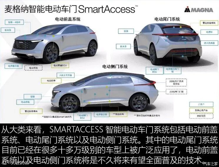 对于走量车型,麦格纳SMARTACCESS智能电动车门系统中的电动前盖、电动侧门、新型车门功能则是现有技术的升级版本,可以优化车辆的使用体验,相信将会很快能够在新车上能够看到,让我们拭目以待吧!