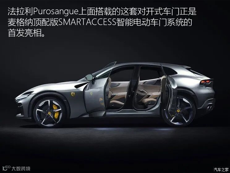 麦格纳最新最顶级的SMARTACCESS智能电动车门系统率先搭载在了法拉利Purosangue这款两厢跑车车型上面。在过去,对开车门是宾利等豪华品牌高端车型的专属配置,采用对开车门的现代跑车屈指可数。