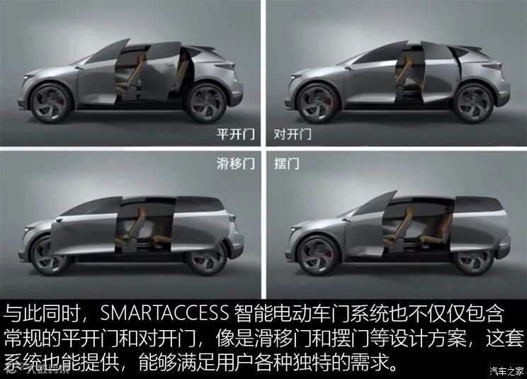 看了上文的介绍,你可能认为SMARTACCESS智能电动车门系统就是一套高级智能对开门系统,实际上SMARTACCESS智能电动车门系统包含了一个完整而庞大的车门技术矩阵,可以满足不同车型对车门系统功能的需求。