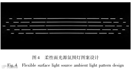 为验证该柔性面光源氛围灯实际光学效果,该样件的硅胶导光板采用400mm×130mm的尺寸设计,设定其宽边为入光面。该面光源氛围灯的表面图案设计如图4所示(点亮后)。