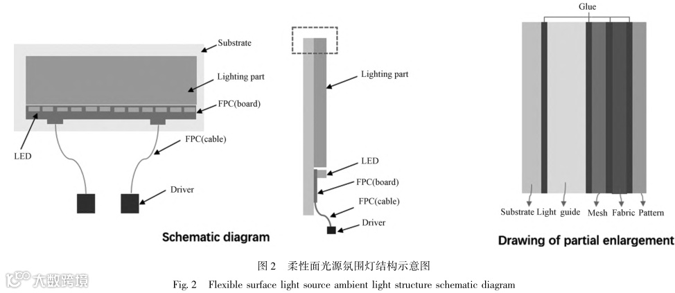 本文所述的柔性面光源氛围灯主要由电子部分和光学部分组成,其中电子部分由FPC灯板、FPC排线以及驱动组成,光学部分则是由图案层、Mesh层、基布层、硅胶导光板等部分组成,其整体结构组成如图2所示。