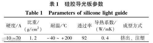光学部分的图案层、Mesh层、基布层、硅胶导光板之间则通过胶合的方式固定,随后整体胶合于座舱骨架之上,在不影响光学效果的同时保证了结构的稳定性。其中硅胶导光板采用了柔性的光学硅胶材质,其材质柔软、光学性能优良、具有较好的材料特性,见表1。基布和Mesh则是起到进一步提高灯具外表面柔软度、舒适度的作用。图案层则可以依据实际使用需求定义其发光图案,满足用户使用需求