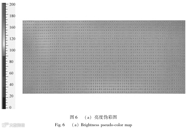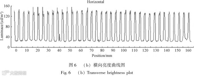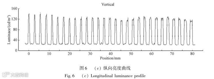 测量结果伪彩图如图6(a)所示,其横向亮度曲线变化趋势如图6(b)所示,其纵向的亮度曲线变化趋势如图6(c)所示。由此可见,横向亮度值在120~150cd/m2之间,纵向亮度值在亮度值在120~150cd/m2之间,整体亮度较高。同时在纵向及横向分布上,其亮度较为均匀,无明显的亮度突变,可满足正常的使用需求。