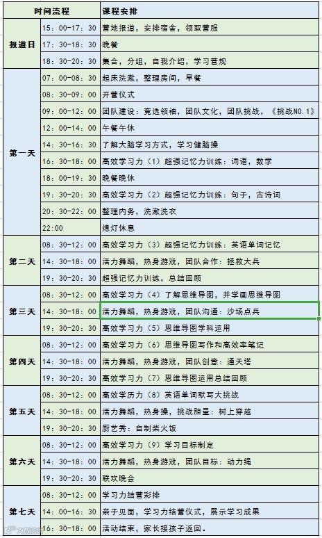 4、收费标准:价值9800元,普惠价5980元/人,包含教学组织、食宿、营服、教室、学习资料、饮水、辅导老师、保险(100万意外伤害和意外医疗保险),备注:以上费用不含往返营地交通,税费。
