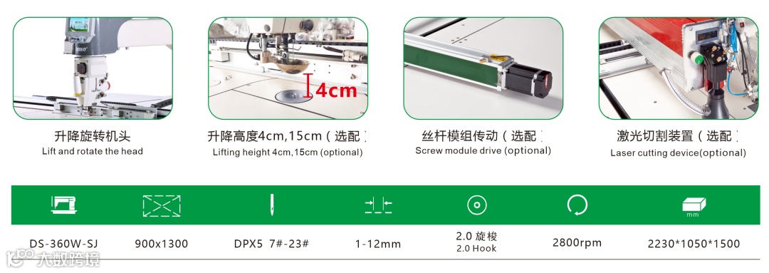 主要适用于沙发、坐垫、抱枕等缝制工艺。增加机头升降功能,可选装升降高度4cm、15cm,2种机型。