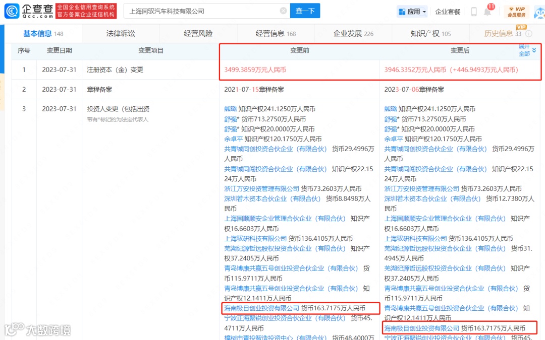 企查查信息显示,近日,上海同驭汽车科技有限公司(以下简称“同驭汽车”)发生工商变更,股东新增小米旗下北京小米智造股权投资基金合伙企业(有限合伙)、建设银行旗下嘉兴宸玥股权投资合伙企业(有限合伙)等,公司注册资本由约3499.39万人民币增至约3946.34万人民币,增幅约12.77%。值得一提的是,去年6月,小米旗下海南极目创业投资有限公司已入股该公司;同年8月,在同驭汽车2亿元A+轮融资中,小米产投与东风交银联合领投。资料显示,同驭汽车为汽车智能底盘系统供应商,成立于2016年9月,其核心团队自2012年起便自主研发线控底盘核心技术,产品覆盖线控电子液压制动系统(EHB)、集成式线控电子液压制动系统(iEHB)、电子驻车制动系统(EPB)、防抱死制动系统(ABS) 、电子稳定性控制系统(ESC)等智能制动系列产品。同驭汽车总部和研发中心设立在上海,拥有上海嘉定、江西宜春两大生产基地,现已建成年产能150万套的智能制造中心。