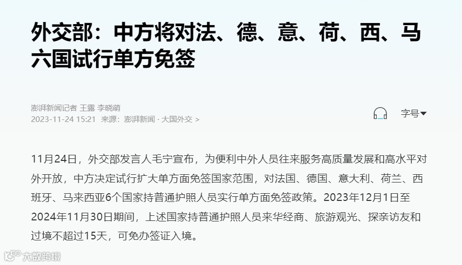 11月24日,外交部发言人毛宁宣布,为便利中外人员往来服务高质量发展和高水平对外开放,中方决定试行扩大单方面免签国家范围,对法国、德国、意大利、荷兰、西班牙、马来西亚6个国家持普通护照人员实行单方面免签政策。