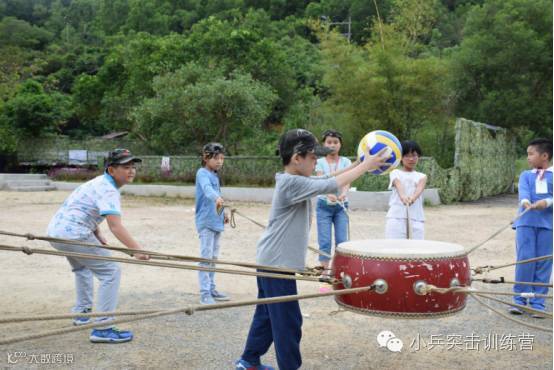 这个项目的名称叫击鼓颠球,也叫鼓上飞球,这是一个以团队挑战为主的项目,挑战我们团队协作的能力。