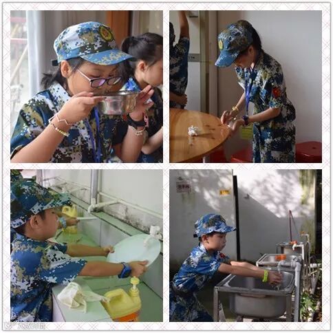 吃完之后,碗筷当然也要自己洗啦!先给教官检查是否吃得干干净净的,然后再去排队洗碗。洗完碗也要记得收拾好自己的餐桌,这可是大家每天吃饭的地方!