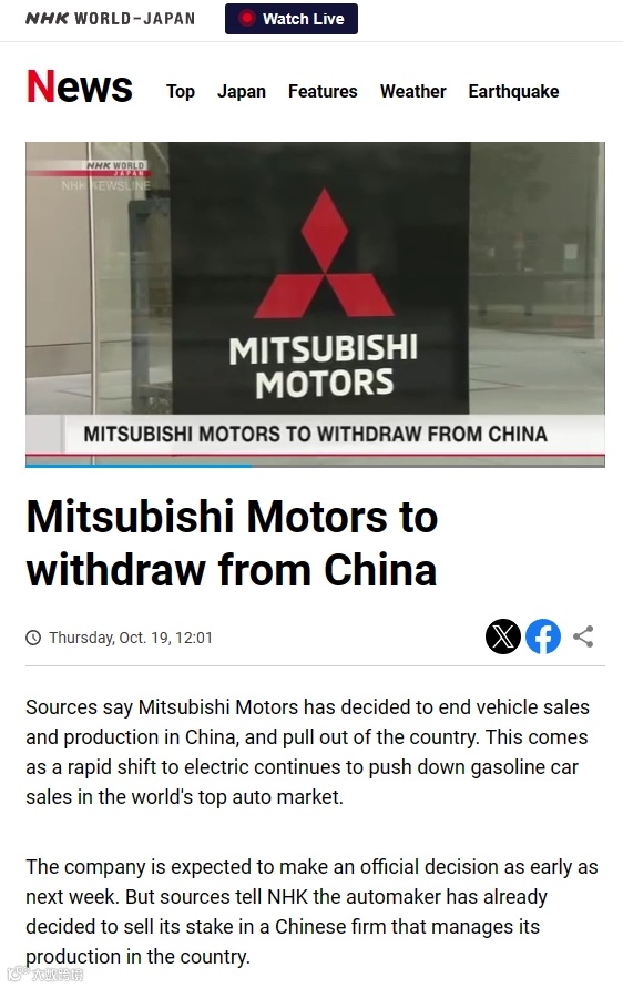 据日本广播协会(NHK)报道,有消息人士向其透露,三菱汽车现已决定终止在华的汽车销售、生产业务,并退出中国市场,预计最早将于下周作出正式决定。同时,消息人士还透露,三菱还决定出售其在一家中国公司的股份,该公司主要是负责管理三菱在中国的生产。值得注意的是,近段时间关于三菱汽车退出中国的消息,隔三差五都会有消息传出。10月6日,有媒体报道日本三菱汽车决定停止在中国生产汽车,日本三菱汽车希望撤回与广汽集团在当地合资企业的投资,不过与广汽集团的合资公司或将保留。工厂方面,广汽三菱在国内的工厂仅有一家,位于湖南长沙的生产基地,后续或将被广汽集团改为纯电动汽车生产基地。当时该报道称,目前日本三菱还在和广汽集团进行最后谈判。